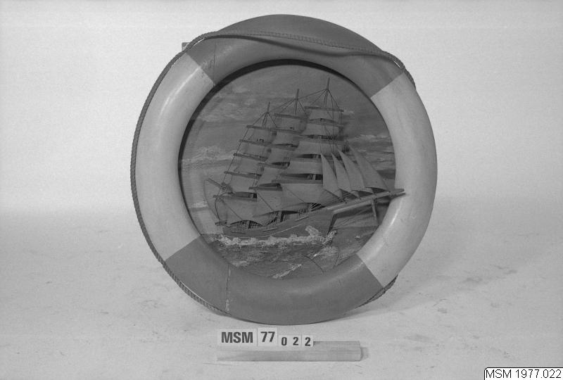 • Tavelmodell, fartygstavla, halvmodell av 3-mastad fullriggare. På masonitplatta. Träram. 1900-talets början. Kuriosa.