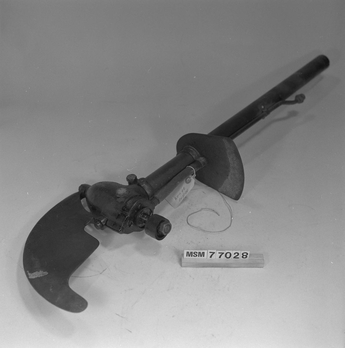 • Båtmotor, utombords, bensin, endast en del av den s.k. riggen. Längd cirka 88 cm. Fabrikat Archimedes? Utan propeller. (en hängetikett med detta inv nr satt på MSM 1967.02.09.02, varför?)