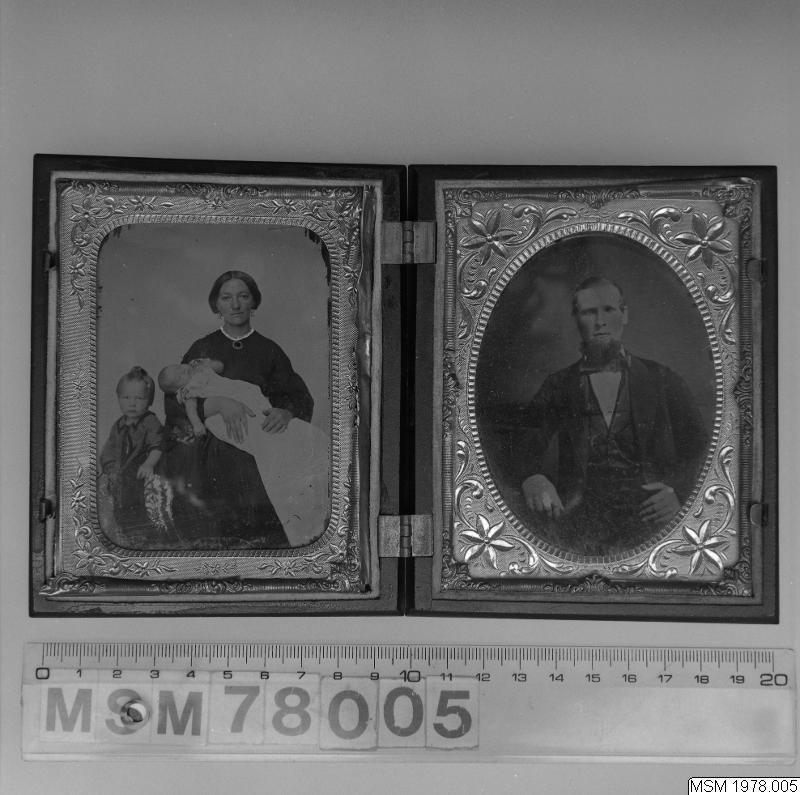 Fotografier, två stycken monterade i bokliknande svart schatull. Daguerreotyp från 1860, tagna i USA av familjen Lars Hansson, Vikhög, fiskeläge i Skåne. Lars Hansson kan vara en broder till Paulus Hansson som tidigt emigrerat med sin familj.