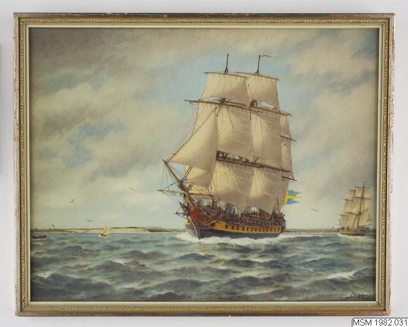 • Reproduktion efter originalmålning av Jacob Hägg med titeln "Ostindieskeppet WASA vid Östergarn".