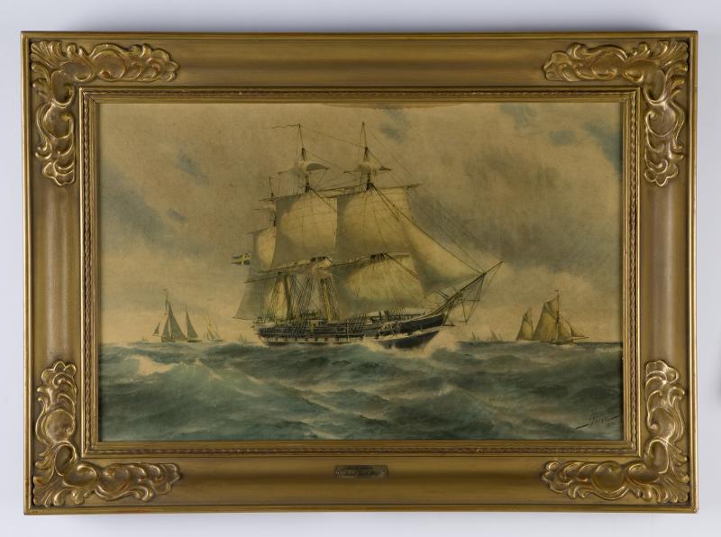 Inramad färgreproduktion efter oljemålning av amiral Jacob Hägg (1839-1931). Motiv: "Korvetten Norrköping" 1892. Fernissad.Korvetten NORRKÖPING byggd i Karlskrona1852. Depl. 1400 tons. Besättning: 340 man. Längd: 47 m, bredd: 12 m,djup: 5,5 m. Bestyckning: 2stx7".28 x 30 p. kanon