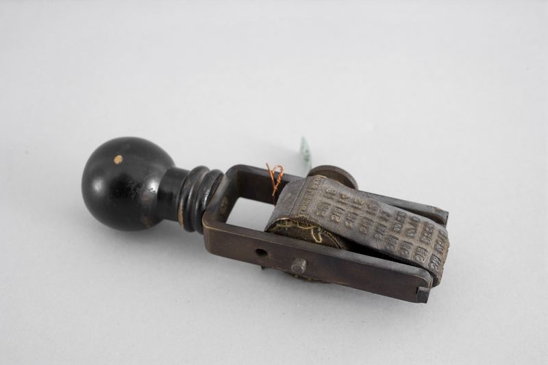 Järnstämpel tillverkad omkring 1915. Upphittad i järnförrådet 1969 av Kockumsarbetare. Text: stål samt 4 siffror (21 olika alternativ). Tillverk.: Nya Stämpelfabriken Malmö Tel 24 004.