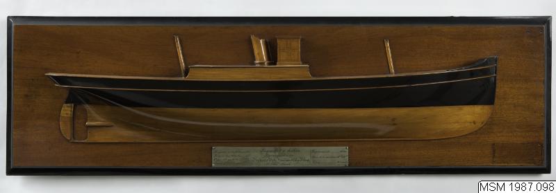 Halvmodell, bgn 19 ss ROGALAND. Bottenplatta av ek med svartlackaerad fräst kant. Skrov av fur, ovan vattenlinjen svartlackerad. Däck av mahogny, däckhus av lind. Något sliten i ytan och något krackelerad. Namnplåt saknas men stor plåt finns. Leverrerad år 1878. Beställare Christiania (Oslo ?) Hamn.