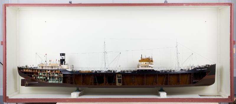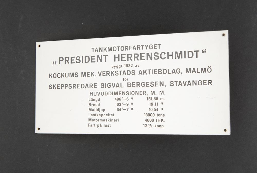Fartygsmodell av Kockumsbygge nr 172 PRESIDENT HERRENSCHMIDT. Text på skylten: Tankmotorfartyget "President Herrenschmidt" byggt 1932 av Kockums Mek. Verkstads Aktiebolag, Malmö. Skeppsredare Sigval Bergesen, Stavanger. Huvuddimensioner, mm. Längd: 496'-6" 151,36 m Bredd: 62'-9" 19,11 m Malldjup: 34'-7" 10,54 m Lastkapacitet: 13900 tons Motormaskineri: 4600 ihk Fart på last: 12½ knop