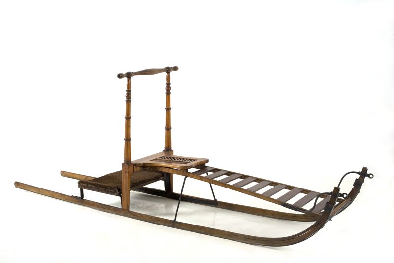 Sparkstötting, trä och järn, 1890-talet. Järnskodda trämedar, mattklädd plattform av järn för den körande, svarvade ståndare med svarvade tvärslåar, förenade med medarnans upphöjda framändar med 2 ribbor, försedda med 9 tvärbräder och med säte. Snöskydd i form av nät inom en ram av försilvrat järn. 2 skaklar fästa vid medarnas framändar.
