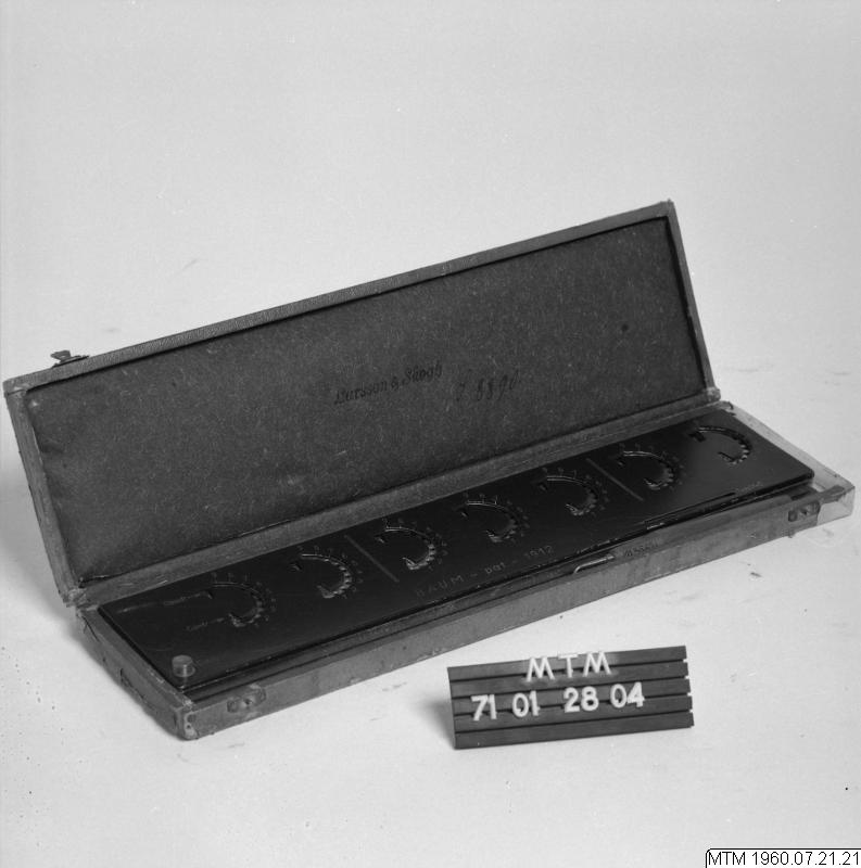 • Räknemaskin av metall. Baums patent. Rektangulär, 1 cm tjock skiva med 7 halvcirkelformade sifferskivor. Märkt Baum / pat / 1912. Pappersklätt träfodral märkt Larsson & Skogh.