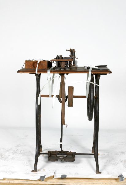Symaskin, trampsymaskin. Underdelen av järn med ett större och ett mindre hjul, omkring vilket remen går. Trampan formad som två fotblad. Skiva av brunt träslag med en underlåda och en fyrkantig överlåda med löst lock. 87 cm hög. Mek. C Bridgeport Comn 93. Wilsons patent 12 nov. 12 th 1850, Aug. 12 th 1851, juni 1215 th 1852, dec. 19 th 1854. And licensed under E. Howe Jr. Patent of sept.10 1846. No. 292093. Gjutjärnsram med såväl svänghjul som remskiva. Ramen skadad. Rost. Tramp formad som två fotblad.