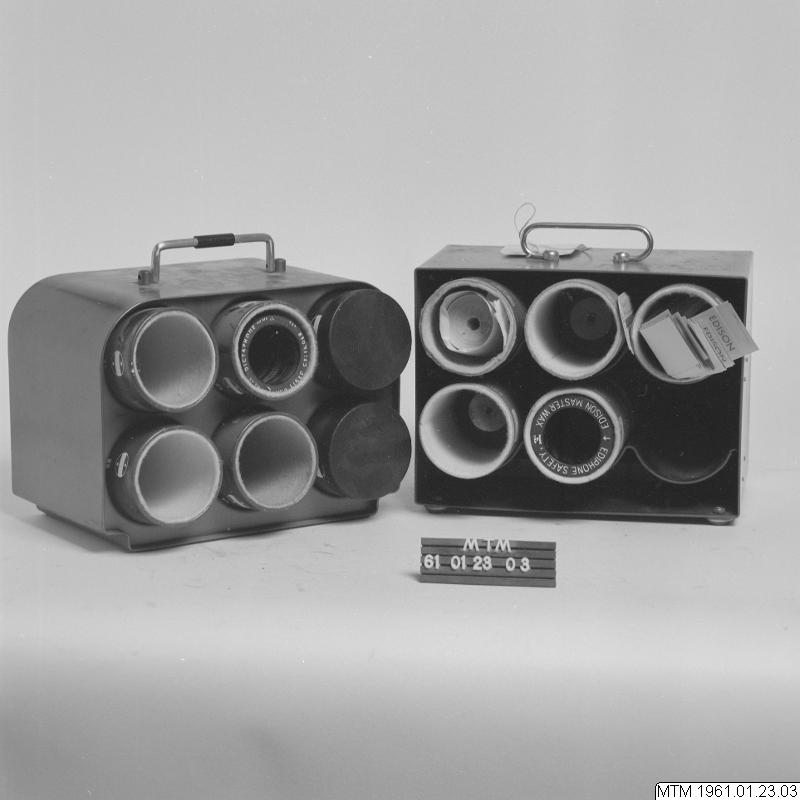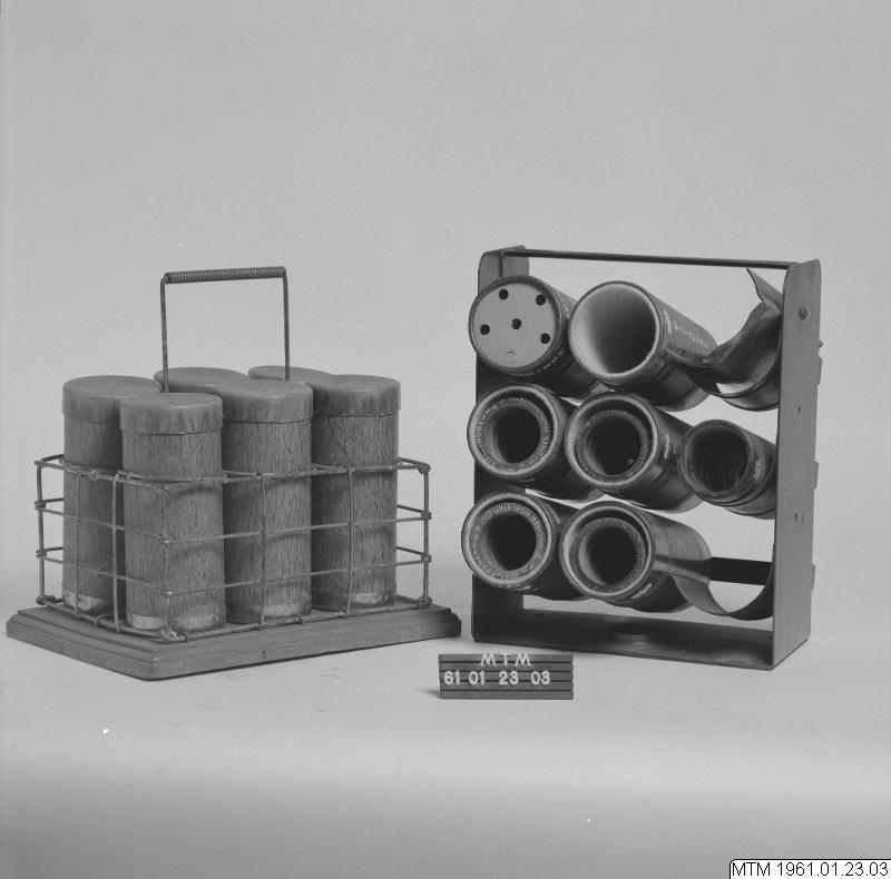 Ställ för vaxrullar till diktafoner. Tillverkat av metalltråd med botten av trä. Fack för sex vaxrullar. Till stället finns 6 burkar av papp innehållande hela vaxrullar från Carl Lindström AG.