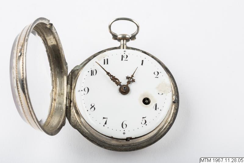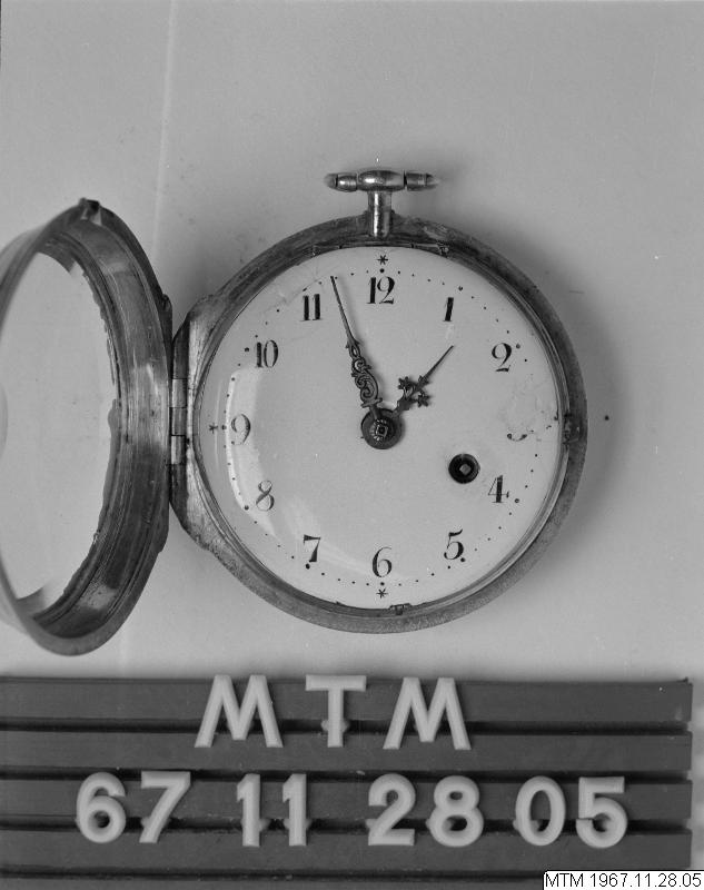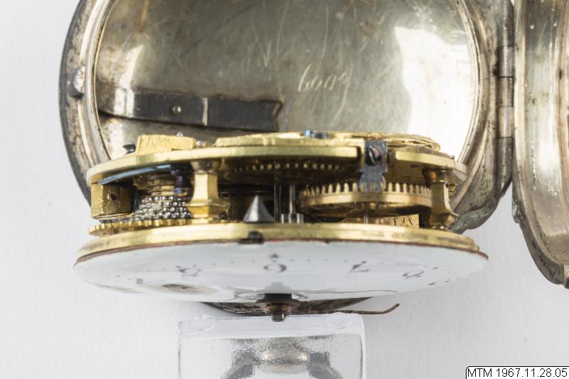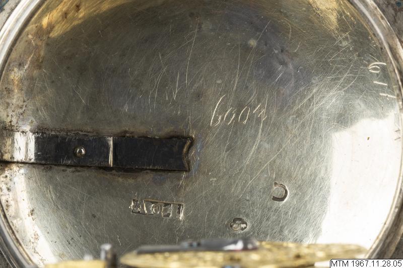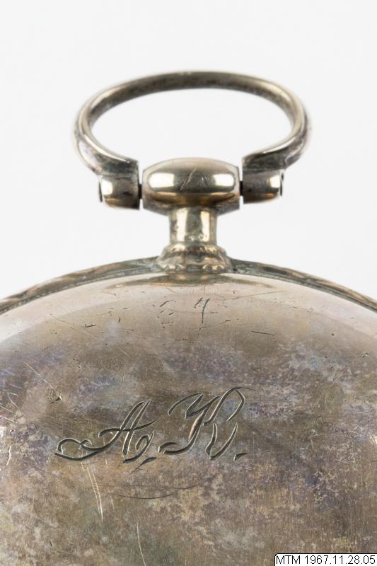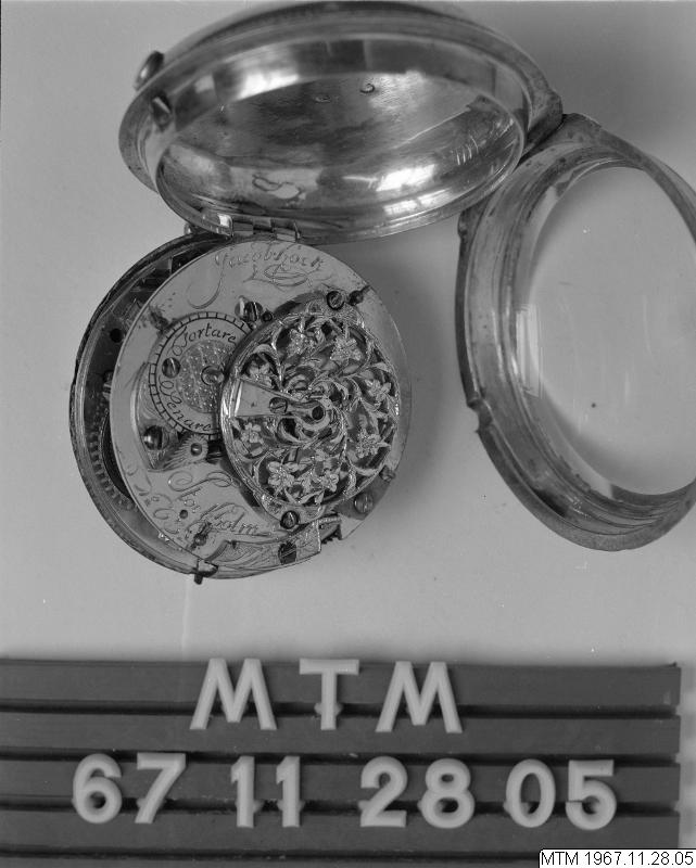 Fickur med urverk av förgylld mässing signerat Jacob Kock Stockholm nr 63. Genombruten klove med motsten av slipad rubin. Balansbryggan fäst med en skruv. Kraftöverföring med snäcka och kedja. Med ruckskiva, blånerad planspiral och verkpelare utförda i egyptisk form. Spindelgång. Urverkets infästning: fällverk. Vit emaljurtavla, från 1800-talet, ej original, med målade arabiska siffror. Mässingsvisare i Louis XV-form som ställs med nyckel. Nyckeluppdrag med 1 st uppdragsnyckel. Silverboett, boettmärken= kattfot C = 1761 samt I.D.V. = boettmakare Jean Francois de Villeneuve. Boetten är utvändigt försedd med ägarmonogramet A.K.