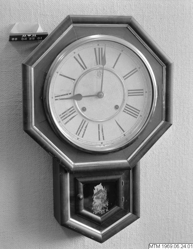 Väggur, fjäderdrivet, 8-dagars pendelverk med slag. Fabrikat: Waterbury Watch Co 1880, New England Watch Co 1898, New York. Vitmålad urtavla med svarta romerska siffror och svartlackerade visare av plåt. Urfodral, åttakantigt, mahognyfanerat med ett smalt, nedtill spetsigt pendelhus. glaslucka med målad dekor.