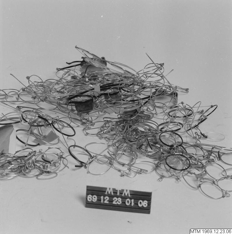 • Glasögonbågar av dublé, 9 st. Saknas 7 st. Kvar, 2 st. för oinfattade glas. Detta nummer och här på följande optikervaror äro inköpta genom Bruuns affär, Klostergatan, Lund.