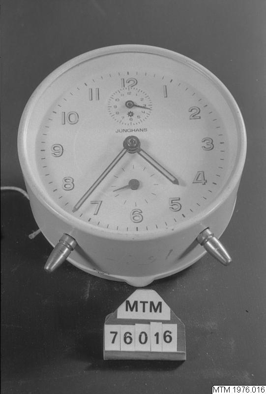 • Väckarklocka med fjäderverk märkt: JUNGHANS. Urfodral av plast.