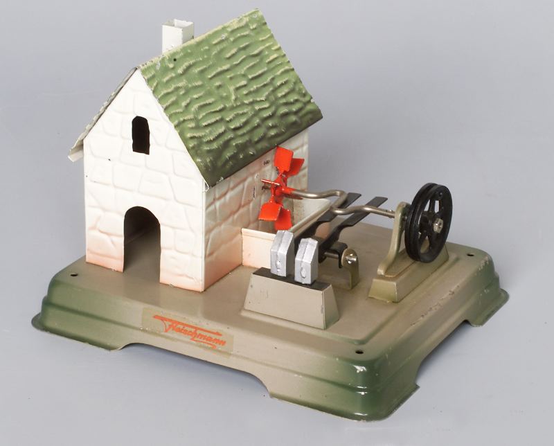 • Smedja, leksak av plåt, hus med vattenkvarnhjul, som driver två hammare. Remskiva. Fabrikat Fleischmann, Västtyskland. 1950-talet.
