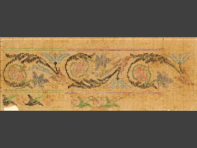 Vävmönster. Uppfodrade på vit foliokartong i pärmar. Blyerts- och färgkritteckning på vitt rutpapper. Rankbård. * Ritare/Ägare: Bengta Eskilsson, lantbrukardotter från Frosta Hammarlunda, f. 14/6 1836, d. 2/1 1923 i Lund, väverska, vävskola i hemmet på Gasverksgatan. År 1867 g.m. malttorkaren Johan Fredrik Eskilsson, d. i Lund 1928. * Förvärvat fr: Eskilsson Anna (dotter till Bengta Eskilsson) f. 5/5 1871, död i Lund 1941. Gift med Erik Lithström och bosatt i Mörsil i Jämtland. Efter mannens död flyttade hon tillbaka till Lund. Förmögen, gjorde flera donationer, bl.a. till textilavd. på Kulturen, den s.k. Lithströmska Fonden. Arkivalier finns.