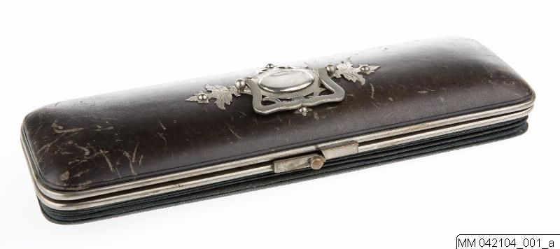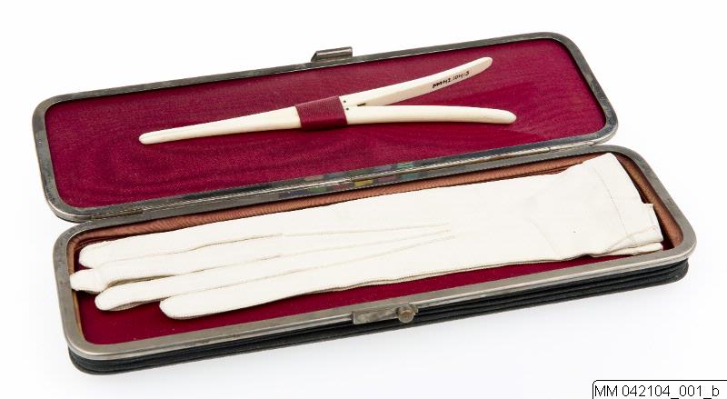 Handskask av svart klot med lock av svart skinn och beslag av vit metall; foder av röd bomullssatin. Innehåller: 1 par vita glacéhandskar. (se MM 042104:002). L 25,5 cm. 1 handskspännare av ben. (se MM 042104:003). L 17,5 cm.
