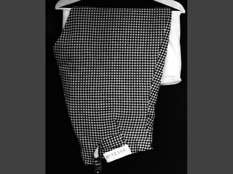 Ridbyxor av brunt och vitt rutigt ylletyg, med förstärkningar på byxbenens insidor (vid knäna) av gråbrunt skinn. Byxbenen knäpps med 8 knappar. Foderskoningar av olika sorters satin och av kläde. Kring midjan 6 knappar av svart metall, märkta: AF. KLEIN & SON MALMÖ. Gylfknappar av svart massa, varav en märkt Peterson & Ritters Eftr. Baktill vid midjan 2 spänntampar, varav en märkt KLEIN & SON MALMÖ 31409 23/X Ingeniör A. Cronquist