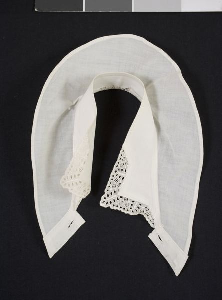 • Krage av vitt bomullstyg. Uppstående, hårdstärkt med bordyrkantade snibbar. Fabrikstillverkad, maskinsydd, men handsydd brodyr. Svart stämpel inne i kragen: 17i A 15 = 38.