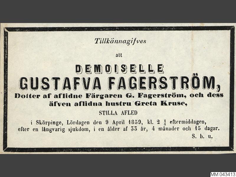 Tillkännagivande om död. Vitt papper med svart tryck. Texten lyder:"Tillkännagifves/att/DEMOISELLE/GUSTAFVA FAGERSTRÖM,/Dotter af aflidne Färgaren G. Fagerström, och dess/äfven aflidna hustru Greta Kruse,/STILLA AFLED/i Skörpinge,Lördagen den 9 April 1859, kl. 2 1/4 eftermiddagen,/efter en långvarig sjukdom, i en ålder af 33 år, 4 månader och 15 dagar."