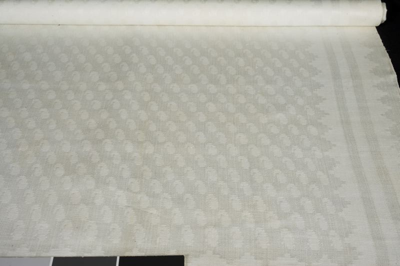 Servett i vit linnedamast. Varp med 26 trådar/cm, inslag med 18 trådar/cm. Randig bård med trappgavelsspetsar ytterst. Spegel med tätt satta, kommatecken-liknande prickar i diagonala ränder. Märkt med plattsöm i vitt. I P 2. Handfållad. Jämför 44.039. * Brukare: Vävd för Jacquette du Rietz (1781-1816) gift 1798 med greve Gustaf Pipa (1771-1857).