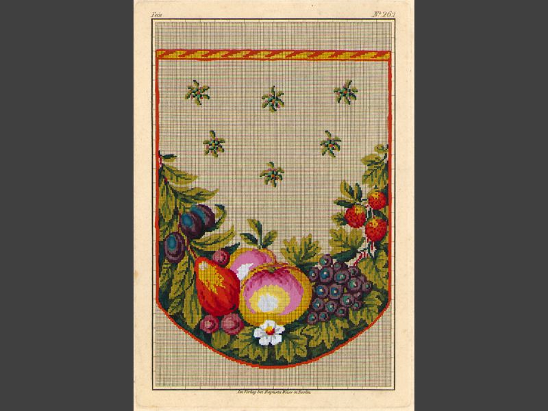 Mönster.För korssöm, tryckt och handkolorerat.Mönster till väska i gult orange, lila och grönt.Fein No 262