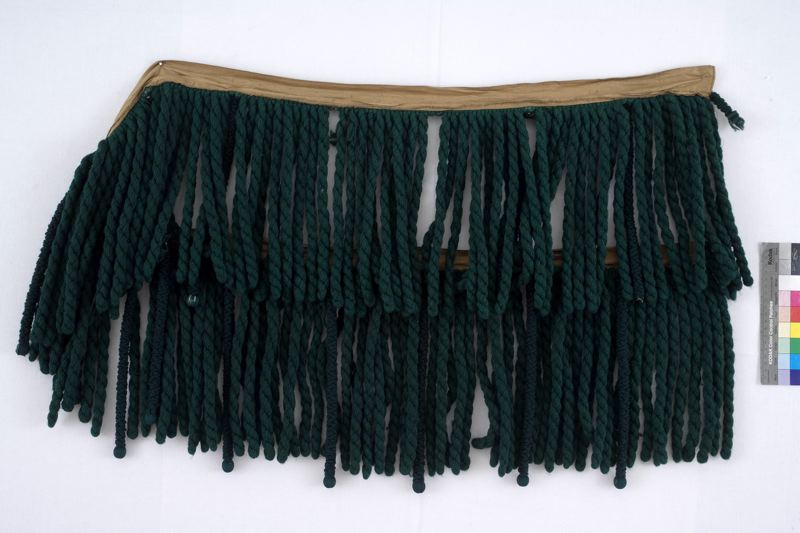 Gardinkappa bestående av snoddfrans av mörkgrönt ullgarn. Fastsydd på gulbrunt fodertyg. På var 15:e cm. en snodd av mörkare grönt ullgarn avslutad nedtill med en garnöverspunnen träkula. Enligt vidfäst lapp: Dessa gröna fransar vill jag minnas ha varit fastfästa vid fönsterkornischerna som kappor ovanpå de vita gardinerna.