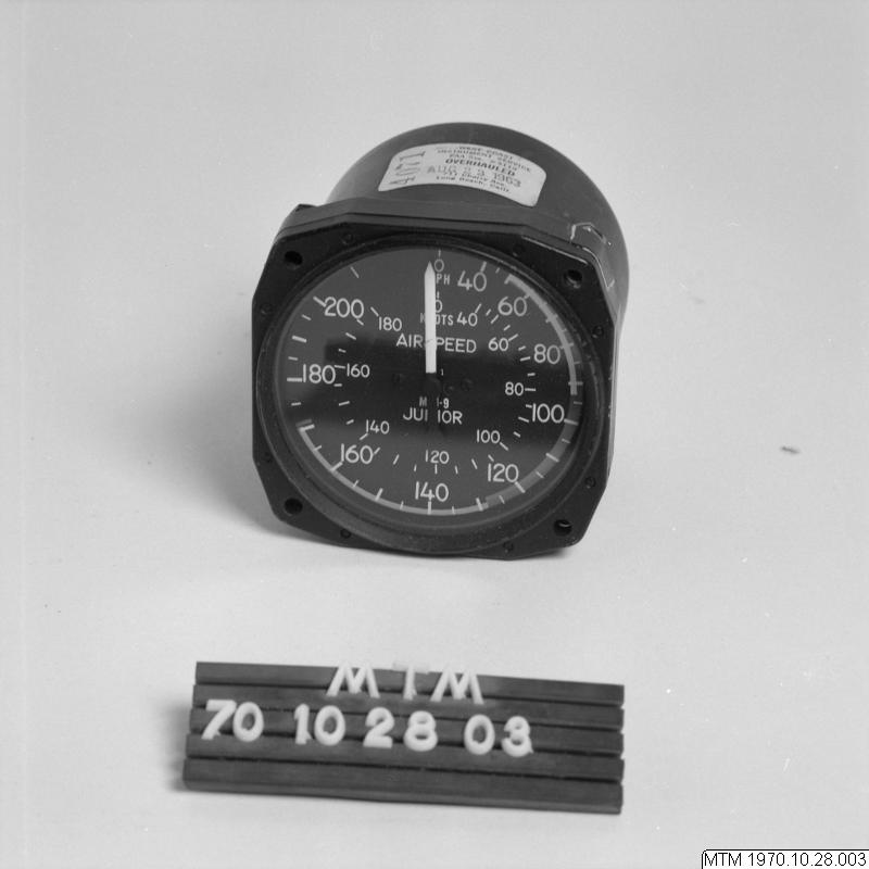 Avsedd för och möjligen använd i en MFI-9 Junior. Graderad 0-180 knots och 0-200-210 mph. Märkt: MFI-9 Junior. Contract no. Nos 94174. F.S.S.C. No. 88-1-350. Mfr's part no. AW-2 3/4-20-B. US Gauge. Märkt med gul färg: No. 17.
