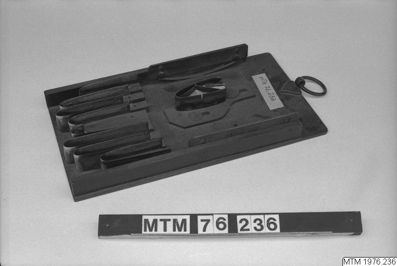 • Stansverktyg av järn och stålplåt som har används för handsktillverkning.