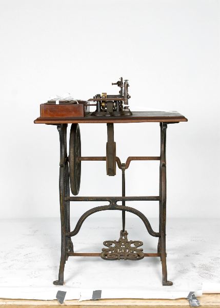 • Trampsymaskin med järnsstativ. Liknar en Wheeler & Wilsonmaskin.