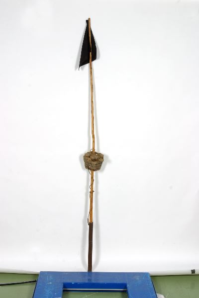 • Nätmarkör bestående av en flaggförsedd träpinne med korkflöte, snöre och järnrör. Flaggan är tillverkad av svart tyg.
