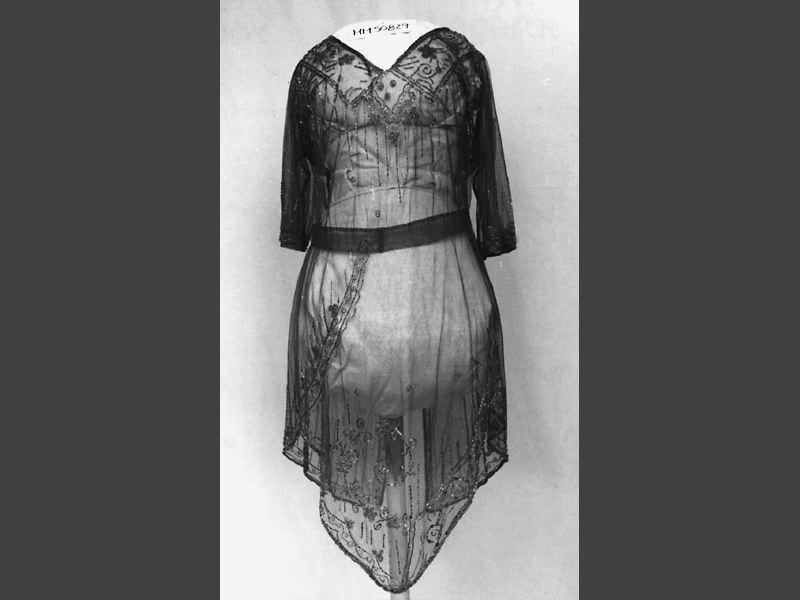 Överklänning bestående av liv med ½ lång ärm och avsprättat skört i tre flikar, av röd silkestyll broderad med silverfolierade glaspärlor. V-formad halsringning fram och bak. Underklänningen saknas. Har varit av halvsiden, éolienne, i samma färg som tyllen.