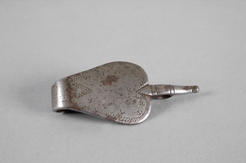 Bälteshake av järn med punsad och graverad dekor. * Brukare: Har tillhört fotografen i Billesholm Hulda Björkgren, dotter till patron Carl Alfred Björkgren, Eksjö d. 1884 och hans hustru Mathilda Augusta Eriksson.