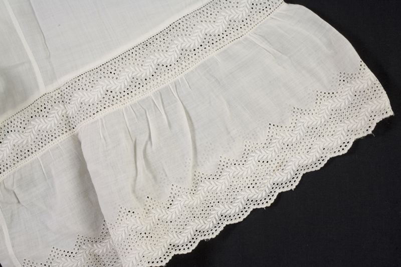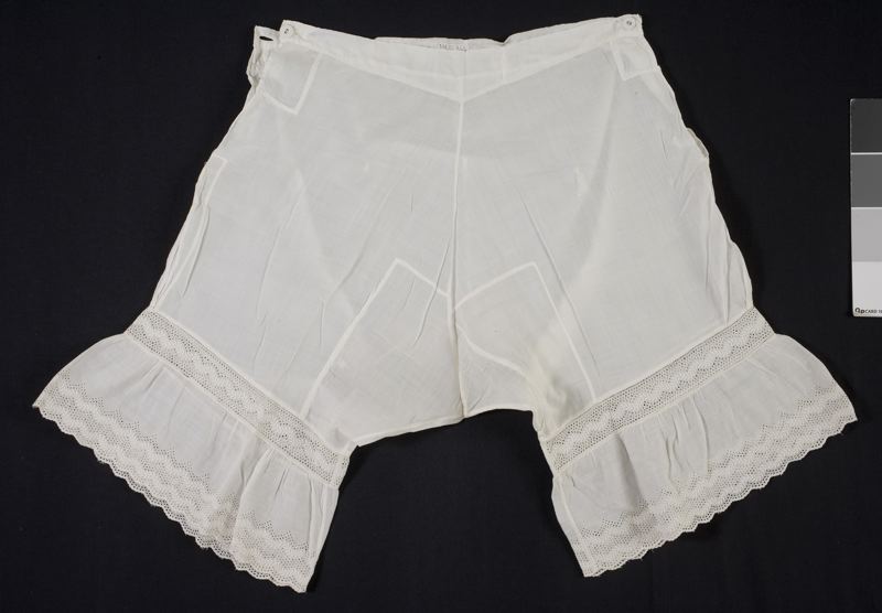 • Underbyxor eller mamelucker, av vitt, tunnt bomullstyg. Sprund i bägge sidor, knäpps med knapp. Benen avslutas med en infälld, maskinbrodyr följd av en volang med samma broderier fast med dubbelt motiv och uddavslutning. Lappade, lagade och stoppade.