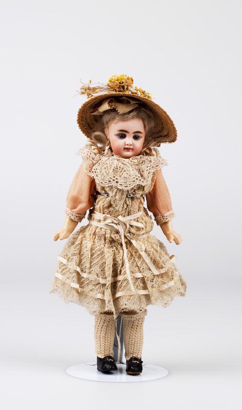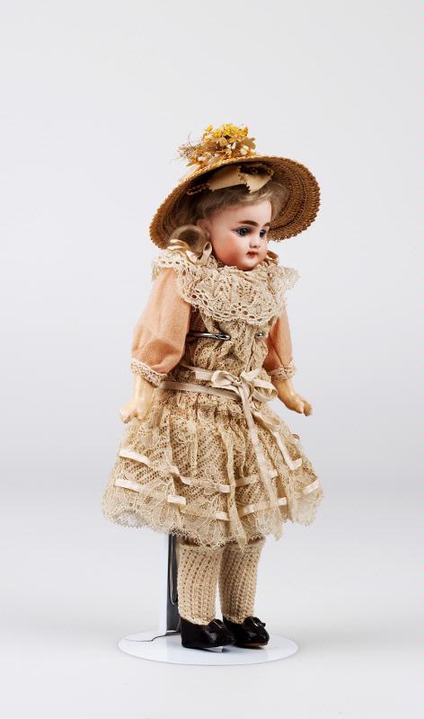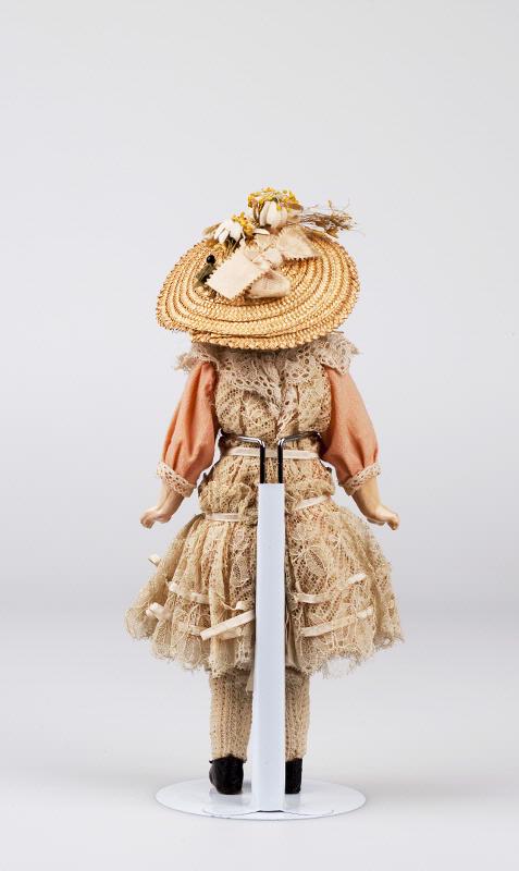 Docka. Huvud av porslin med gult riktigt hår blå ögon av glas. Kropp av massa, axlar höfter och knän ledade. Fabrikskläder. Linne och byxor i ett, underkjol av tarlatan med spetsar. Klänning av rosa tarlatan med överklänning av gula spetsar med genomdragna rosa band, ärmar av rosa ylle. Hatt av halmflätor garnerat med rosa prästkragar. Vita strumpor, svarta skor.