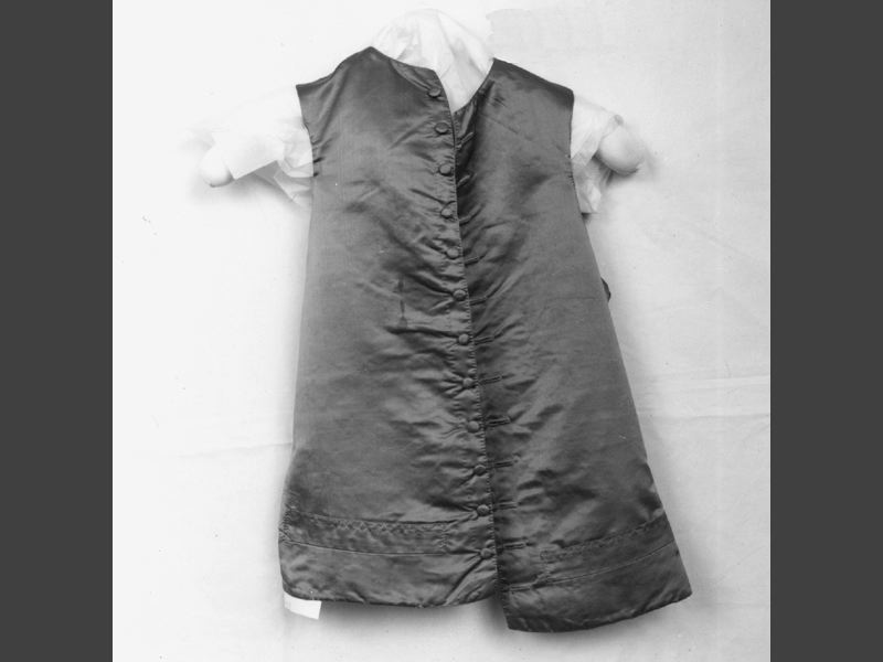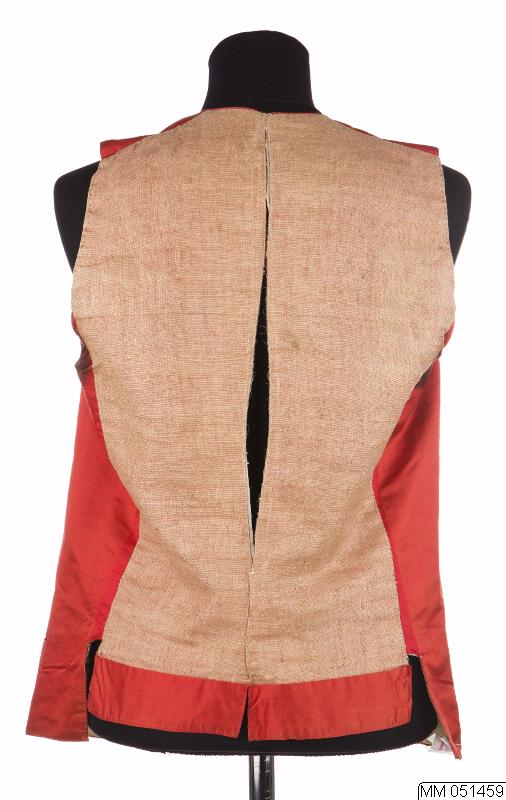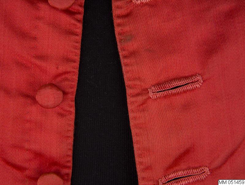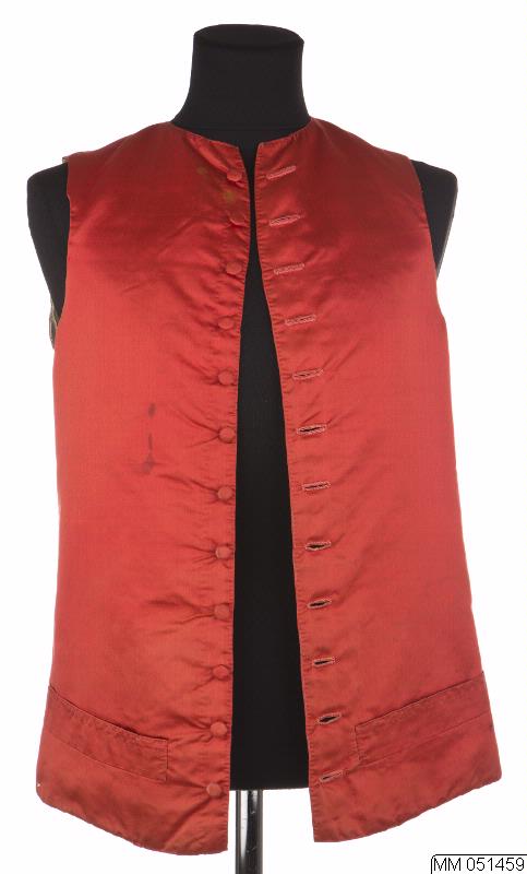 Väst tillhörande "svenska dräkten", av röd sidenatlas. Rygg av brunrött linne, foder av vitt linne. 2 stolpfickor. Knäpps med av sidenet överklädda knappar, knapphål.