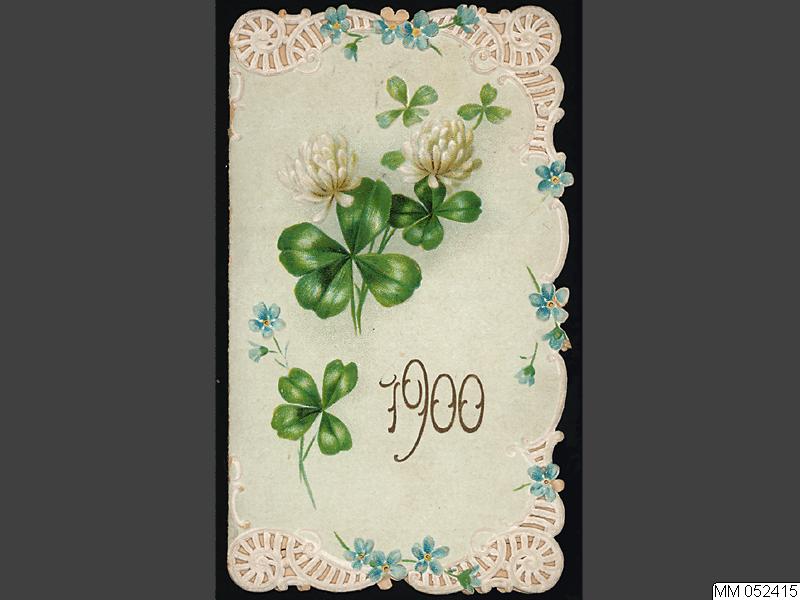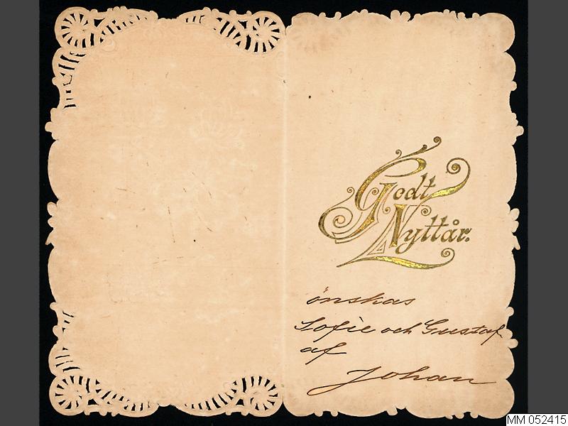 Nyårskort av dubbelvikt kritpapper med blindtryck och på framsidan färgtryck i blått, grönt, gult och guld. Text på utsidan: 1900. På insidan: Godt / Nytt år, samt med bläck: önskas / av Sofie och Gustaf / af / Johan. Med blyerts på baksidan: 6016/20.