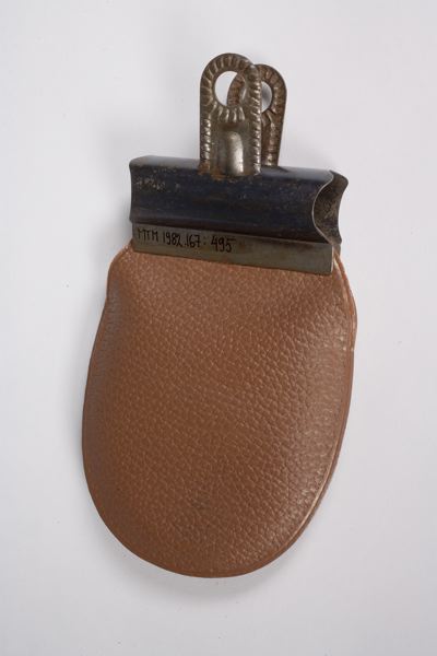 • Papperklämma av stål hållande ett brunt plastfodral vilket innehåller ett tygfodral till ett öronskydd. Har hängt på verktygstavla (längst ner till vänster) MTM 1982.167:489.