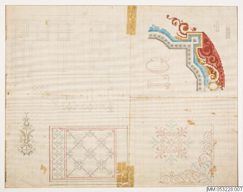 • Rutmönster. 2 olika bottnar, bårder, stjärnor och monogram, tecknade med blyerts och färglagda med rosa, ljusblått, grått, gult, blått och rött på tryckt