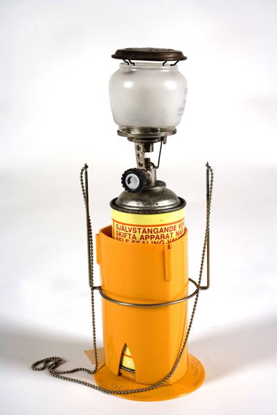 Primuslampa med liten lampkupa av glas, plasthållare och kedja för upphängning. Drivs av butangas. Gasburken märkt 2201. DOT-2P CTC-2P. Troligen använd på fartyget Fritiof (Schebo).