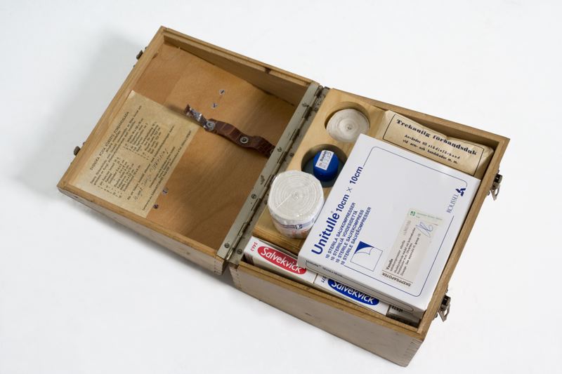 Lådan innehåller även häftet "Anvisningar rörande första hjälpen vid olycksfall" tryckt 1951.