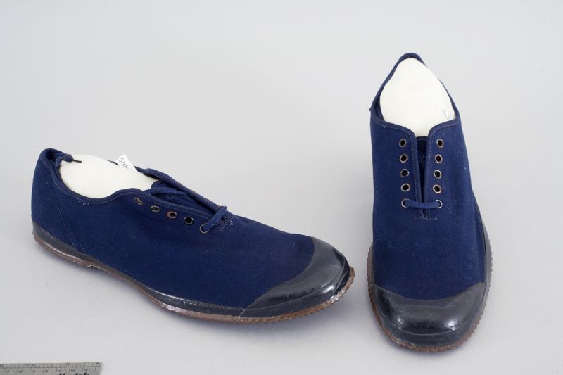 • Gymnastikskor i blå bomullsmärting. Blå skoband och gummisula. Tåparti av gummiklätt.