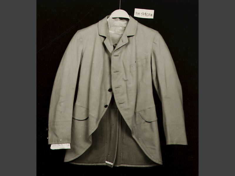 Jaktrock av rött kläde. Liggande krage och korta slag. Ficklock. Framstyckena rundade nedtill. Knäpps med 4 släta metallknappar, knapphål. Foder av röd flanell. Märkt med textil etikett, logotyp och text: Palmqvist & Jönsson MALMÖ
