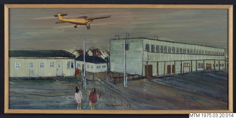 I målningens förgrund syns själva flygfältets öppna plan. I mellangrunden syns i mitten ut- och infart med resta vita spärrbommar och öppen grind. T.v. vakthusets ljusa envåningslänga där man skymtar vakten i fönstret och en kvinna i röd kappa vid husknuten. I högra bildfältet syns den gamla stationsbyggnaden. Utanför grindarna ligger ett mindre envåningshus med tak av svart tjärpapp och bakom det...