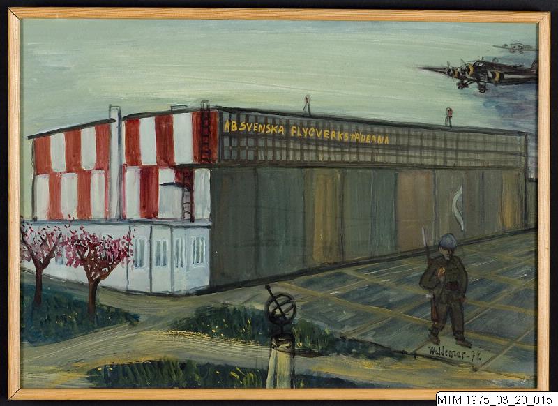 • Målningen domineras av en stor hangarbyggnad med namnet AB SVENSKA FLYGVERKSTÄDERNA i gul text högt upp på fasaden. På denna sida av hangaren är färgerna mörkt gråbruna och grågröna. På gaveln t.v. finns ett randigt mönster av starkt lysande rött mot gråvit bakgrund. På den öppna planen framför hangaren syns t.h. en patrullerande beredskapssoldat med gevär på axeln. På himlen rakt ovanför syns i h... Visa hela