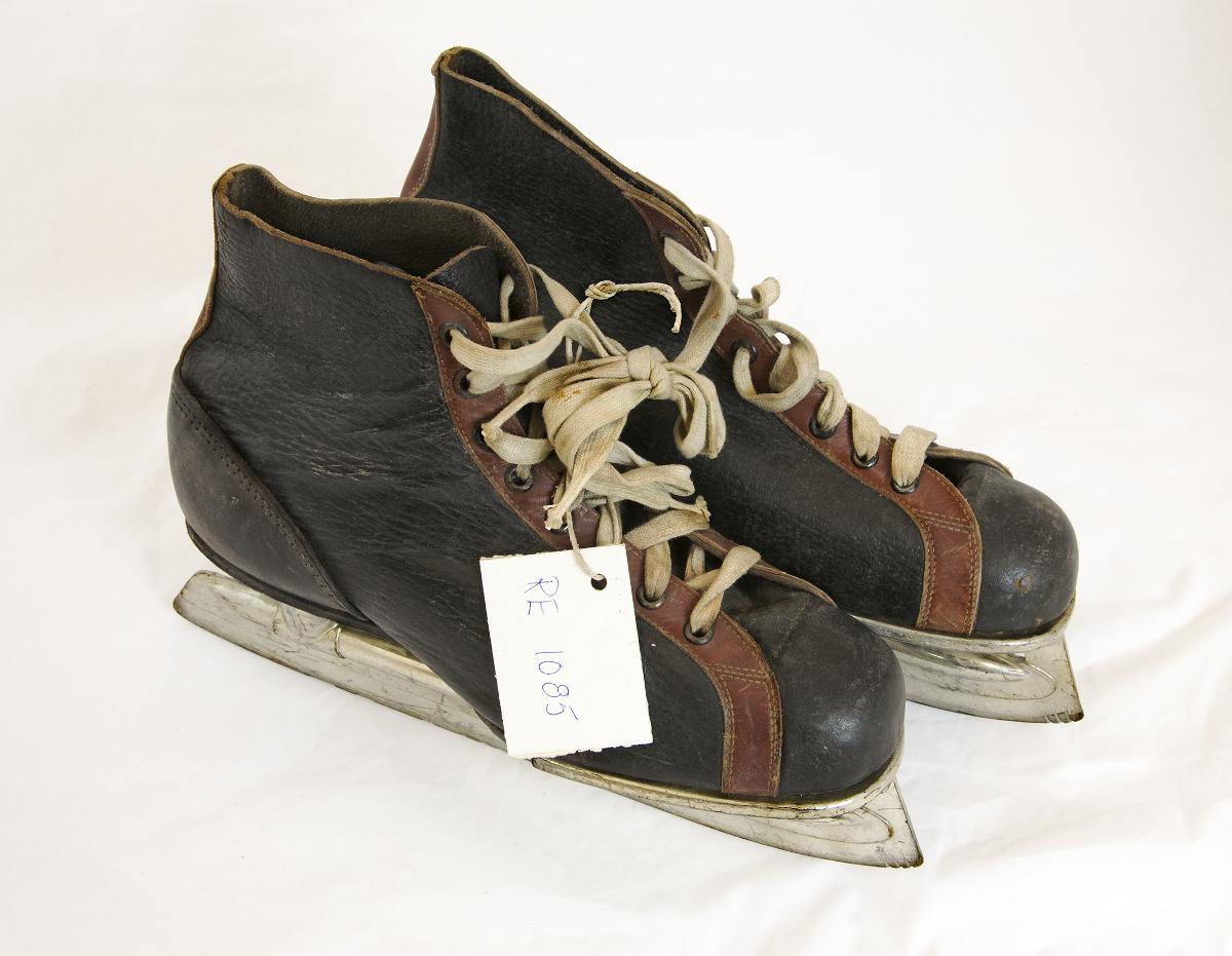Ett par svarta bandyrör med bruna detaljer och vita skosnören. Märkning på undersidorna: ”ALBIN JOHANSSON PAT. No 58128 ÖREBRO”. Instansad märkning på sulornas undersidor: ”40”. Uppges vara inköpta i slutet av 1940-talet.