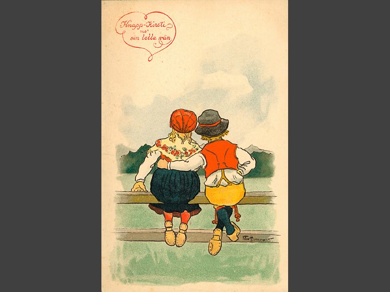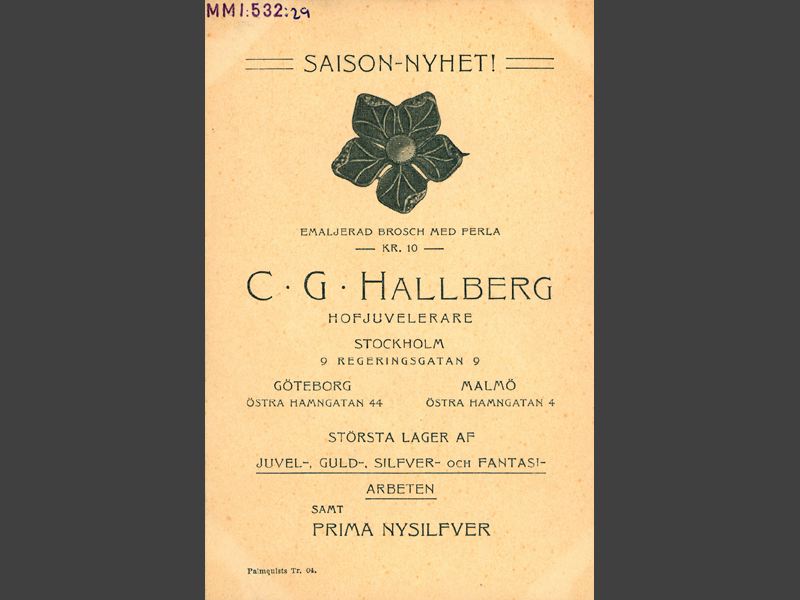 Reklamkort av papp och färgtryck med reklam för " Emaljerad brosch med perla 10 kr. C.G. Hallberg hofjuvelerare". På baksidan en bild på ett par som sitter på ett staket med ryggen emot.