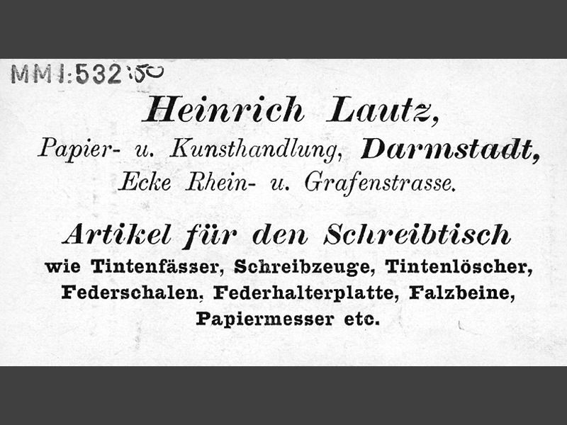 Reklamkort av papp för Heinrich Lautz, papier- und Kunsthandlung. På baksidan foto av Hessens prinsessa, Elisabet. Under fotografiet står Elisabeth, Prinzessin von Hessen, geb 11. März 1895 + 16. Nov, 1903. På andra sidan står: " Heinrich Lautz, / Papier- u. Kunsthandlund, Darmstadt, / Ecke Rhein- u. Grafenstrasse. / Artikel fur den Schreibtisch / wie Tintenfässer, Schreibzeuge, Tintenlöscher, / Federschalen, Federhalterplatte, Falzbeine, / Papiermesser etc. Gåva 1969 av fröken Elisabeth Gyllenbergs stärbhus, gnm. bibliotekarie Brita af Jocknick.