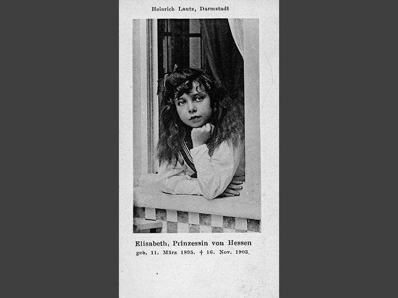 Reklamkort av papp för Heinrich Lautz, papier- und Kunsthandlung. På baksidan foto av Hessens prinsessa, Elisabet. Under fotografiet står Elisabeth, Prinzessin von Hessen, geb 11. März 1895 + 16. Nov, 1903. På andra sidan står: " Heinrich Lautz, / Papier- u. Kunsthandlund, Darmstadt, / Ecke Rhein- u. Grafenstrasse. / Artikel fur den Schreibtisch / wie Tintenfässer, Schreibzeuge, Tintenlöscher, / F...