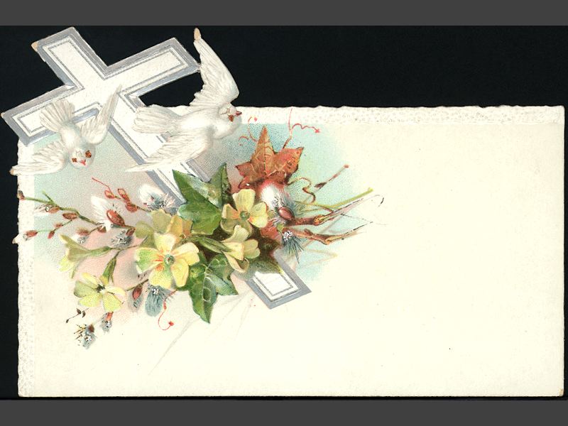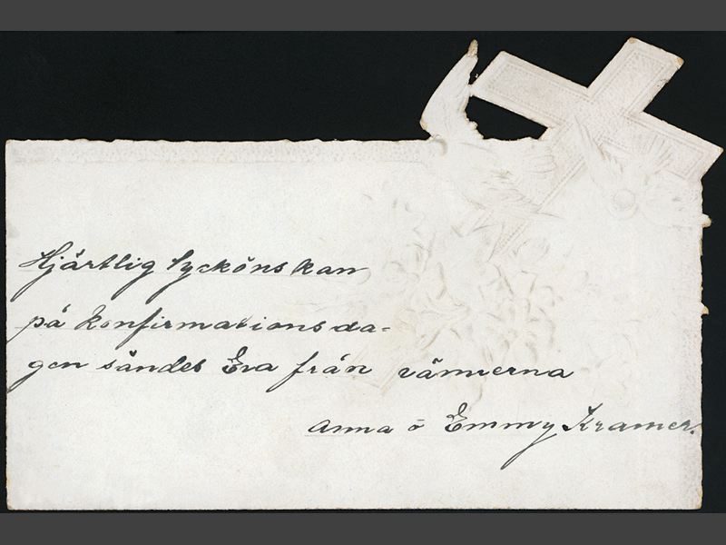 Konfirmationskort av papper med färgtryck och reliefpressad dekor. Bild föreställande två vita duvor flygande framför ett kors. Vid basen av korset en bukett av gula, blommor, vide och gröna blad. På baksidan handskriven text: Hjärtlig lyckönskan på konfirmationsdagen sändes Eva från vännerna Anna & Emmy Kramer.