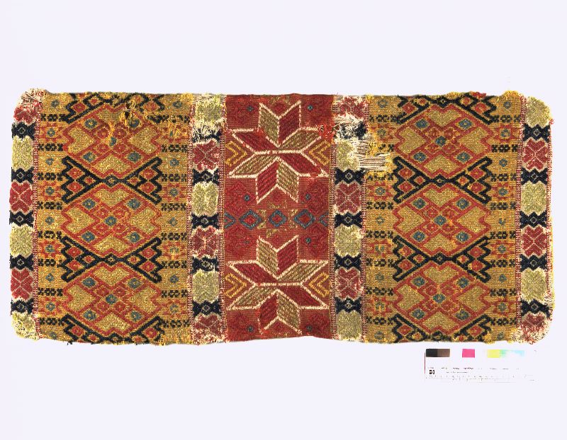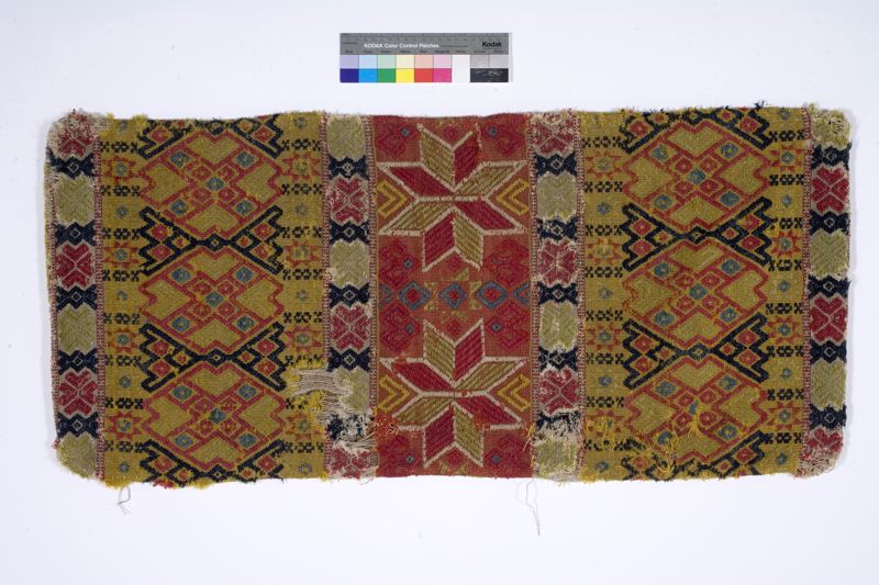 Åkdyna vävd i krabbasnår med linnevarp 4,5 tr. per cm. Inslag ullgarn 22 tr. per cm. Bottnarna i gult och rött smalbårderna även vitt. Mönstret plockat över 3 eller 5 varptrådar i färgerna kallrött mörkblåt, ljusgrönt, gult och mellanblått. Baksida i inslagsrips 2,5 tr. grov lingarnsvarp. Inslag av vitt lingarn och brunrosa ullgarn (krapp) 18 tr. per cm. Spår av ursprunglig halmstoppning. 1800-talet Skåne trol. * Färg: kallröd, mörkblå, ljusgrön, mellanblå, brunrosa. Gåva, införd juli 1966, av före skepphandlaren Sigfrid Eiswolhd Järnvägsgatan 47 Limhamn. Enligt uppgift vävd av hans mormor. Hans mor Janna Persson född 1855 död 1932 var från Jerrestad.