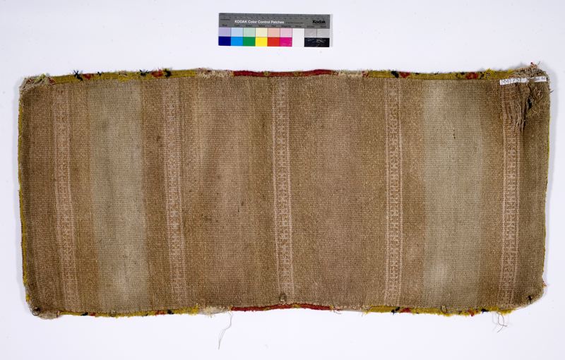 Åkdyna vävd i krabbasnår med linnevarp 4,5 tr. per cm. Inslag ullgarn 22 tr. per cm. Bottnarna i gult och rött smalbårderna även vitt. Mönstret plockat över 3 eller 5 varptrådar i färgerna kallrött mörkblåt, ljusgrönt, gult och mellanblått. Baksida i inslagsrips 2,5 tr. grov lingarnsvarp. Inslag av vitt lingarn och brunrosa ullgarn (krapp) 18 tr. per cm. Spår av ursprunglig halmstoppning. 1800-ta...